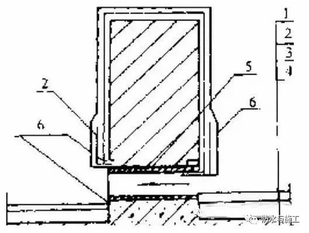 圖1 反挑梁過水孔洞1—防水層;2—附加層;3—找平層;4—結(jié)構(gòu)層;5—預(yù)埋管;6—密封材料當(dāng)過水洞出現(xiàn)滲漏時,應(yīng)檢查預(yù)埋管是否破裂,無埋管時,應(yīng)檢查洞內(nèi)及周邊的防水層是否完整,并按上面方法更換預(yù)埋管,修補完善好防水層。四、內(nèi)水落口漏水(一)現(xiàn)象:水落口杯與構(gòu)件結(jié)合處嵌填不密實,雨水沿縫隙滲漏。(二)原因分析:水落口杯與結(jié)構(gòu)之間的縫隙沒有嵌填密實柔性密封膏,未做防水增強層。(三)防治措施:水落口杯和水落管在安裝前,應(yīng)檢驗合格,杯口應(yīng)低于找平層,周圍與混凝土接觸處的縫隙必須用1:2:2的細石混凝土或 1:2.5水泥砂漿嵌填密實,沿管周留設(shè)20mm×20mm的凹槽,槽內(nèi)嵌填柔性密封材料,先做好杯口及周圍的防水增強層,再進行防水層施工。當(dāng)水落口杯周圍產(chǎn)生滲漏時,應(yīng)清除其周圍的防水層,沿水落口杯周圍鑿20mm×20mm的槽,清掃干凈后,用柔性密封膏嵌填,再作防水涂料增強修補。